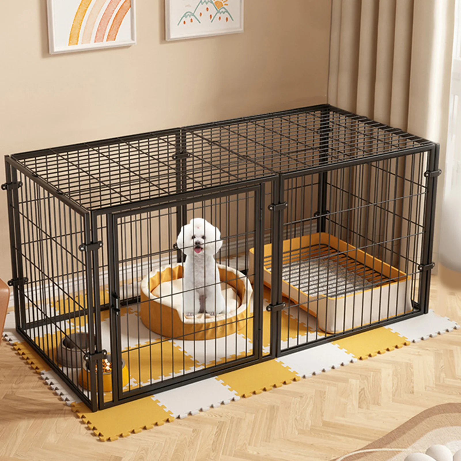| 48 Inch Puppy Playpen Easy Assemble Heavy Duty Wire Dog Crates Metal Grid Dogs Cage Kennel Stackable for Puppy/Small Dog/Rabbit/Pig Features: 1.Reliable Security Structure: Built with a sturdy iron frame and reinforced steel wire interior, this puppy playpen ensures your furry friends are safely contained. The top cover design prevents escape, making it safe for all small pets. 2.Convenient Foldable Function: The kennel cage features an easy-to-use double-sided folding system, allowing U/Z-shaped setups to fit different spaces and daily needs. Quick to collapse for compact storage or portability. 3.Modern Home Style: Stylishly blending spray-painted MDF and lacquered metal, this pet pen complements home decor with a premium look. The slightly arched door fits nicely at entrances or on stairways for seamless integration. 4.Versatile Placement Anywhere: Effortlessly block pets in doorways, entrances, hallways, bedrooms, or stairs. With two support feet padded with EVA foam, this heavy duty wire dog crates design protects floors from potential damage. 5.Quick, Tool-Free Assembly: No assembly required for the dogs cage kennel. With detailed instructions provided, you can set up in minutes without any tools, offering a stress-free and efficient user experience. Specification: Origin (Country or Region): Mainland China (Origin) Product Dimensions: 1200.00 x 600.00 x 600.00 mm / 47.24 x 23.62 x 23.62 inches Material: Iron wire Note: 1 x Puppy Playpen |