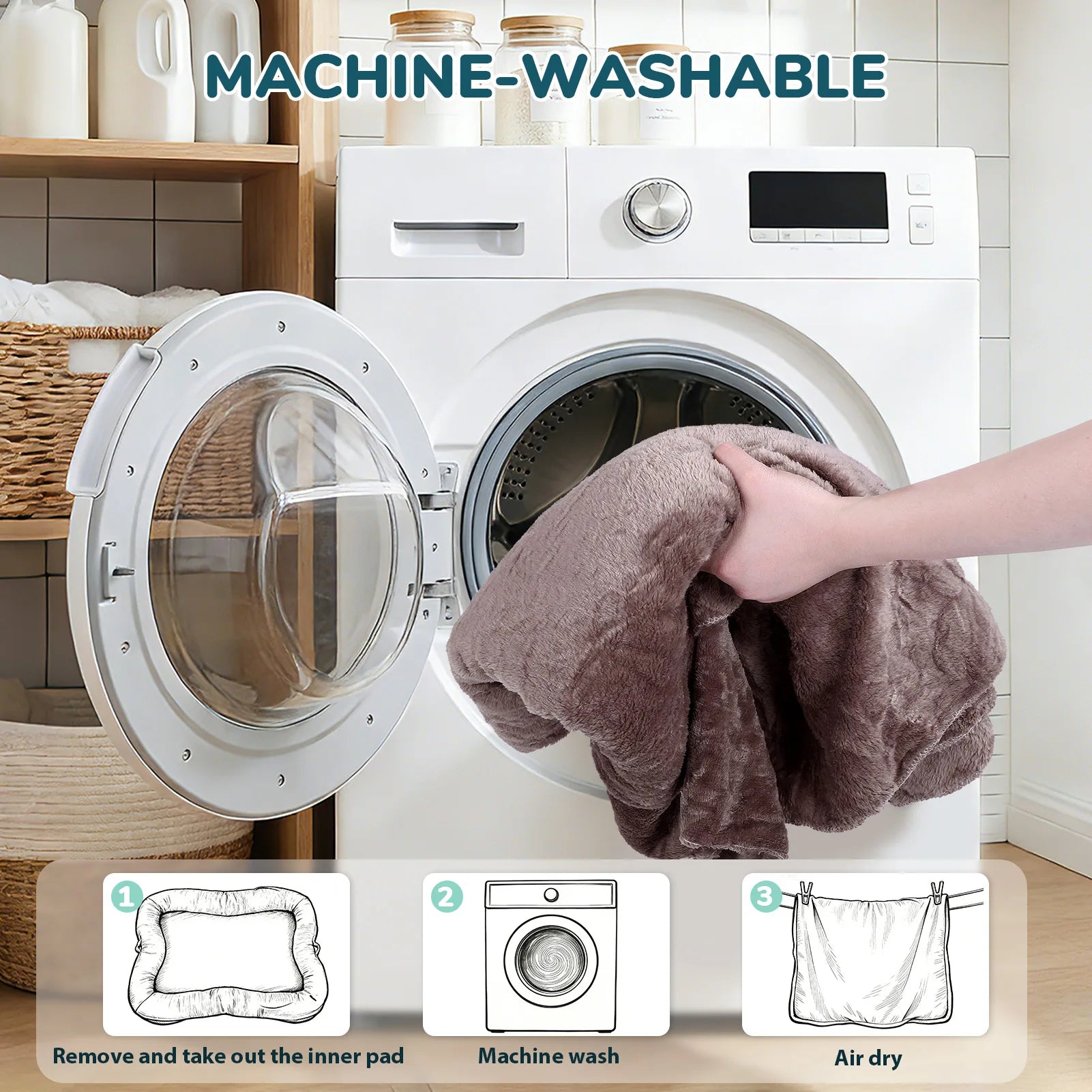 - The zippered cover with removable filling is machine washable on a gentle cycle, the included blanket adds extra warmth, and the non-slip bottom keeps the bed in place.