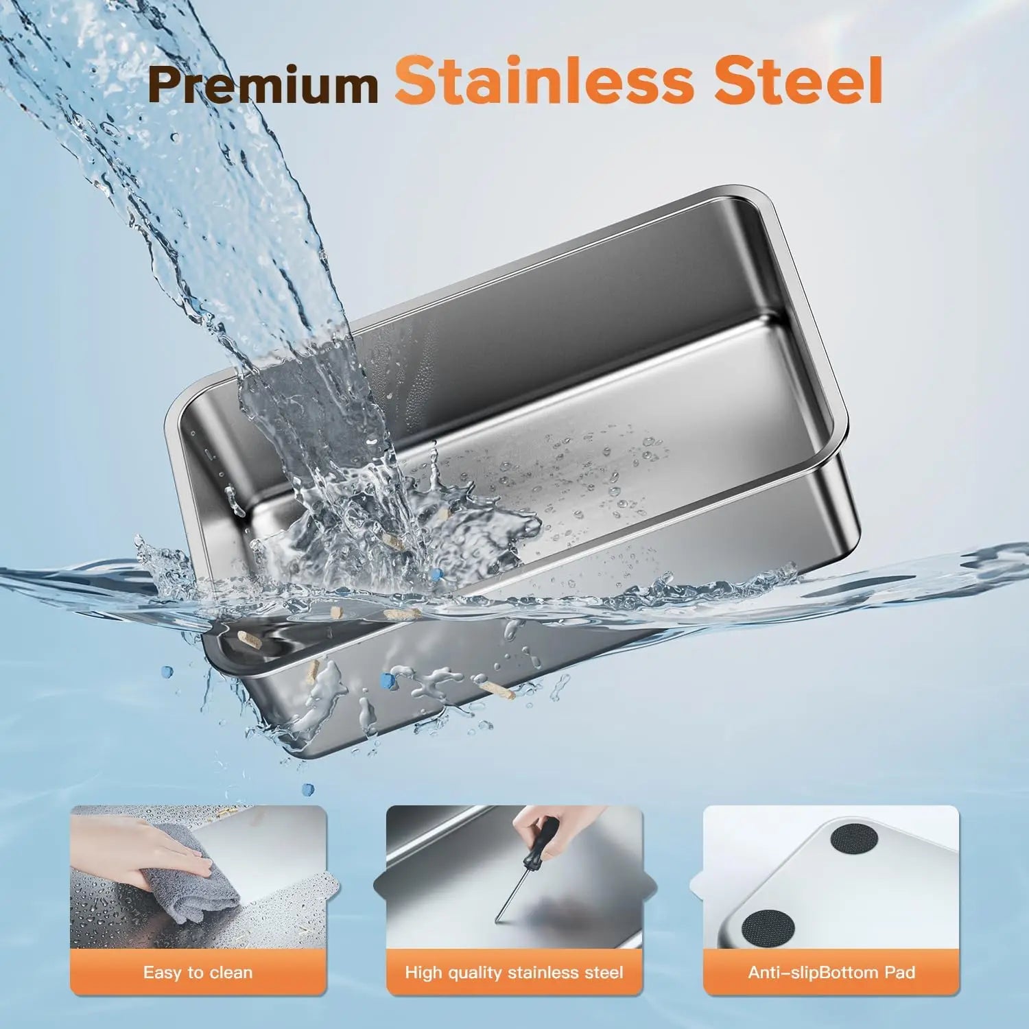 - Durable stainless steel: rust-proof, scratch-resistant surface with non-stick finish that wipes clean in seconds; anti-slip feet keep it stable on your slick floors.